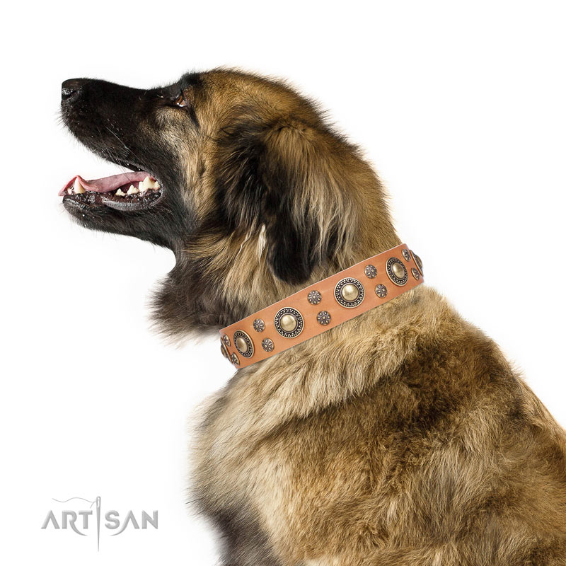 Leather dog collar with reliable hardware and ravishing decorations