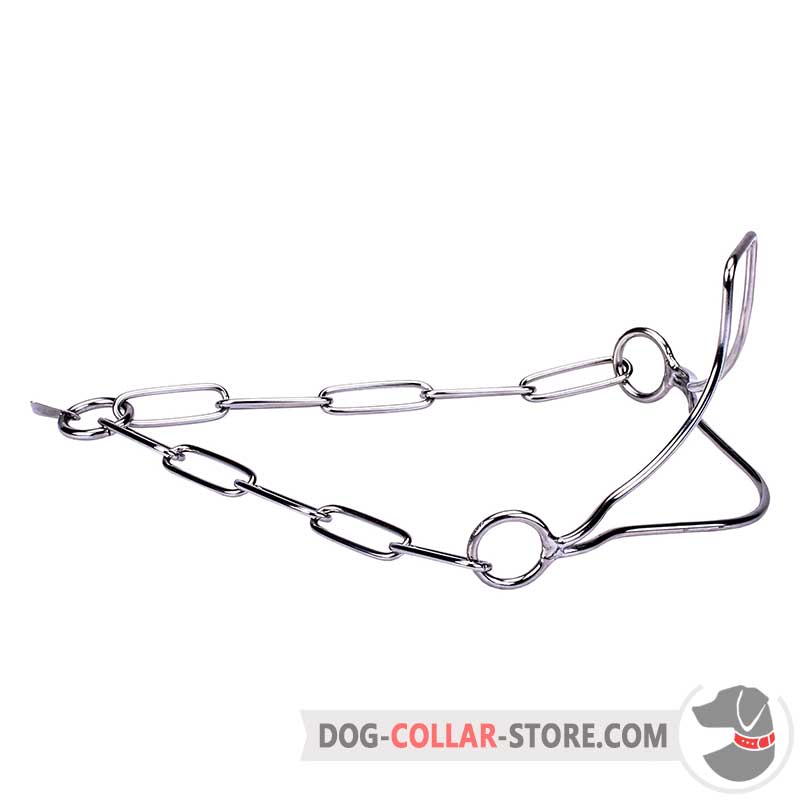 The presented show dog collar features great strength and reliability. It is made of stainless steel that looks shiny and won't lose its brilliance with time as it's 100% non-corrosive. Each link's diameter is 1/9 inch (3 mm) (which is pretty large to save the dog's fur) and the chain's width is 3/5 inch (15 mm) (optimal for dog shows). Besides, this show dog collar has a unique shape to support the head: it won't let the dog lower the head.
